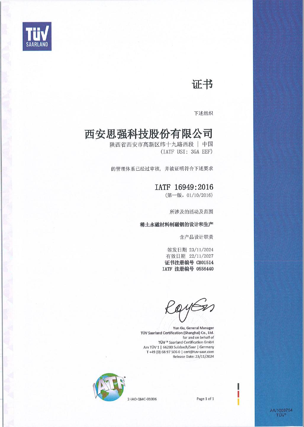 2024年11月23日,經審核,TÜV Saarland Certification(Shanghai)Co.,Ltd.天佑唯薩爾認證(上海)有限公司向西安思強科技股份有限公司簽發了《IATF16949:2016管理體系證書》。